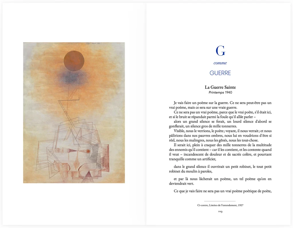 Pensé comme un livre d’art autant que de littérature, ce volume propose une sélection de textes rares et essentiels, en résonance avec notre monde contemporain. Il s’adresse aux lecteurs de poésie, aux amateurs de Paul Klee et à celles et ceux qui cherchent des formes nouvelles pour penser le monde. Par la qualité de ses reproductions et la force de ses textes, il trouve sa place autant sur une table de travail que dans une bibliothèque de beaux livres : un compagnon de route pour qui cherche une autre manière de regarder le réel.